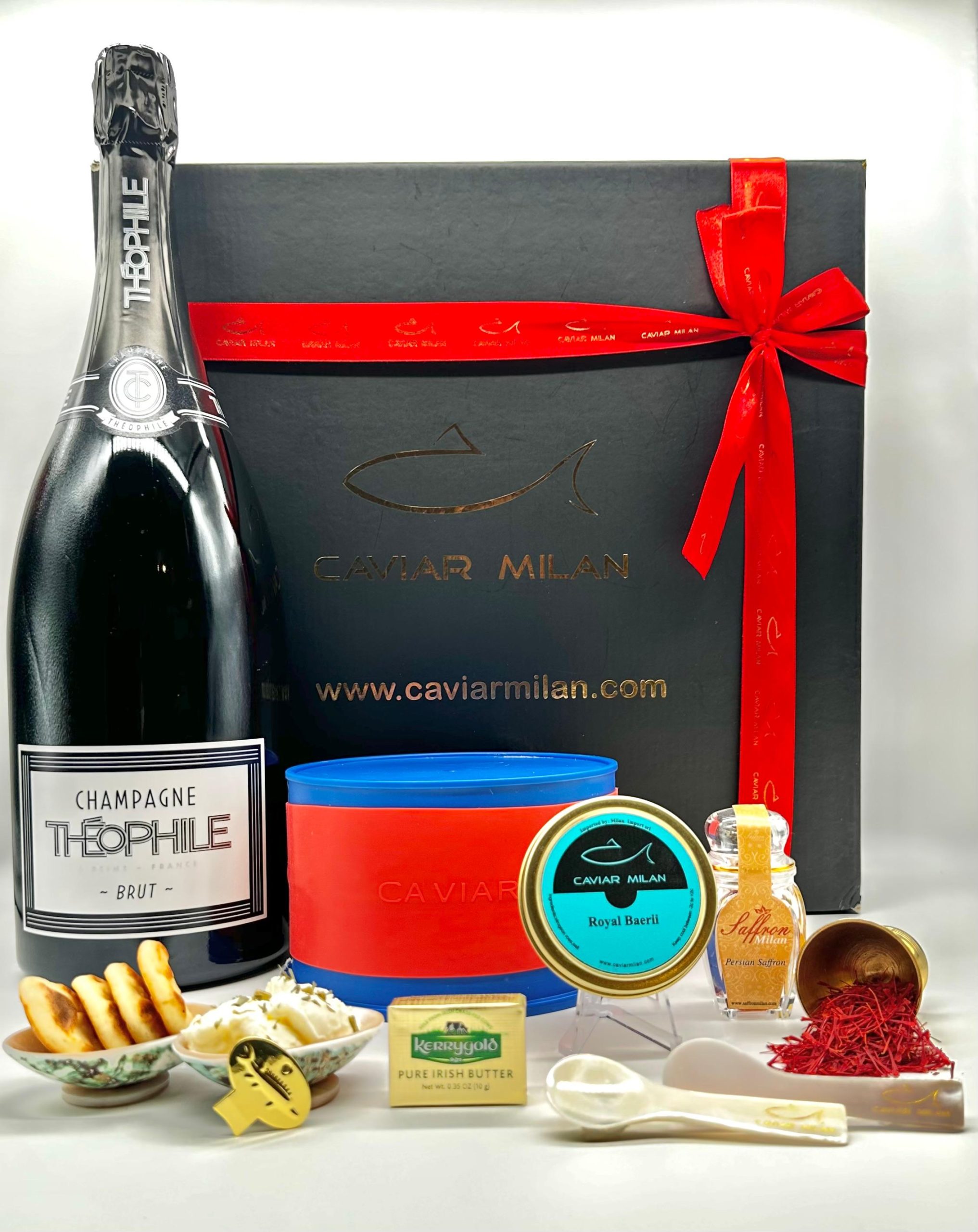 Concediti il cesto regalo di caviale e prodotti esclusivi curato da Caviar Milan. Il set è composto da Caviale Royal Baerii, Zafferano Persiano qualità Super Negin, Champagne, Burro, cremé fresh e blinis! Inoltre è compreso set di cucchiaini in madre perla, chiave apri caviale e borsetta frigo.
