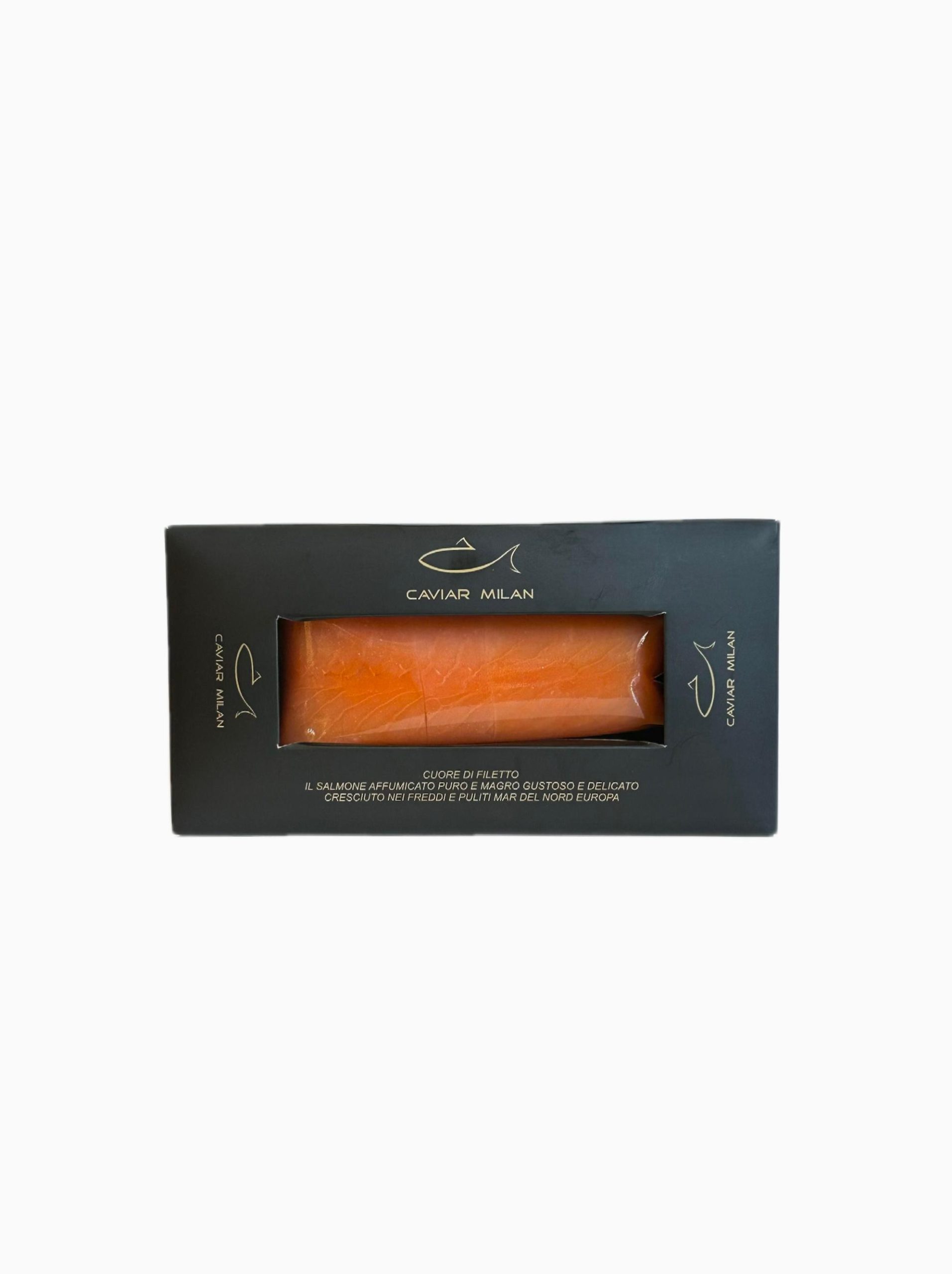 Cuore di Filetto di Salmone Il Cuore di filetto è ricavato dal dorso del salmone e rappresenta la sua parte più pregiata. Il metodo Caviar Milan prevede una marinatura con poco sale e zucchero alternati, e un’esclusiva affumicatura realizzata con legno di faggio dell’Appennino emiliano, garantendo una delicatezza unica.